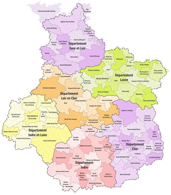 La région compte environ 30 pays géographiques et historiques (Sologne, Berry, Touraine, Beauce, Perche, etc.), chacun possédant une identité paysagère et architecturale très marquée.